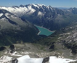 Lage des Friesenberghauses (vorne rechtes), in der Mitte Schlegeisspeicher, dahinter die Hochfeiler-Gruppe, vorne links das Petersköpfl | Eigenes Werk | Stefan.straub | Datei:Friesenberghaus-lage.jpg | |