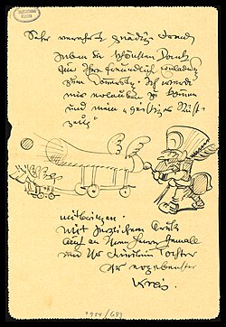 | Einseitiger Brief mit Zeichnung von Julius Kreis an Frigga Brockdorff-Noder, undatiert; Literaturarchiv Monacensia, Signatur: Kreis, Julius A I/3 | Monacensia | Julius Kreis | Datei:Brief Julius Kreis an Frigga Brockdorff-Noder.jpg | |