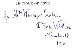 | Fritz Wittels Autograph 1930 Wanda Tauber | Fritz Wittels: Critique of love . New York: The Macaulay Company, 1929 | Fritz Wittels | Datei:Fritz Wittels Autograph 1930.jpg | |