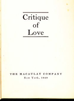 | Fritz Wittels Critique of love . New York: The Macaulay Company, 1929. Universitätsbibliothek Duisburg-Essen | Fritz Wittels: Critique of love . New York: The Macaulay Company, 1929 | Fritz Wittels | Datei:Fritz Wittels Critique of love 1929.jpg |