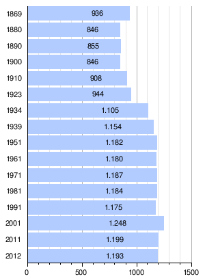 Bis ins 14. Jahrhundert wuchs die Bevölkerungszahl der Gemeinde, da es eine gute Infrastruktur und eine ertragreiche Landwirtschaft gab. Um 1450 setzte dann jedoch ein Siedlungsrückgang und ein Bauernsterben ein, das durch eine langandauernde Agrarkrise, durch eine ungünstige Klimaveränderung und durch Seuchen wie die Pest ausgelöst wurde. Dieser Rückgang ist bis ins 15. Jahrhundert bemerkbar. In der zweiten Hälfte des 19. Jahrhunderts gab es wieder einen Rückgang der Bevölkerungszahl, da die Bauern ihren Landbesitz stets vergrößerten und somit andere Bauern aus dem Gebiet verdrängten. Seit etwa 1900 ist die Bevölkerungszahl wieder stabil.[11]