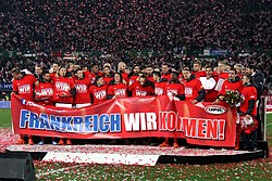 | UEFA Euro 2016 qualifying, Group G – Austria (red shirts) vs. Liechtenstein (blue shirts) 3–0 (1–0) on 2015-10-12 in Ernst-Happel-Stadion , Vienna – The photo shows the honoring of the entire team of Austria for the successful qualification for the European Championship. | Eigenes Werk | Steindy ( Diskussion ) 22:35, 14 October 2015 (UTC) | Datei:AUT vs. LIE 2015-10-12 (009).jpg | |