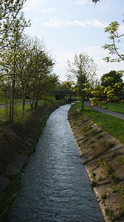 | Fußenauer Kanal im Ried in Dornbirn , Vorarlberg , Österreich Blick zur Rheintalautobahn A14 bei Gewässerkilometer 1,10. | Eigenes Werk | Asurnipal | Datei:Fußenaukanal- bei Autobahn(Gkwm 1,10)-03.JPG |