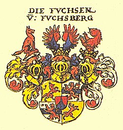 | Wappen der Fränkischen Adelsfamilie der Freiherren Fuchs von Fuchsberg | eingescannt von User:Wuselig aus: Horst Appuhn (Hrsg.), Johann Siebmachers Wappenbuch. Die bibliophilen Taschenbücher 538, 2. verb. Aufl , Dortmund 1989 | Johann Siebmacher | Datei:Fuchs von Fuchsberg Siebmacher023 - Freiherren.jpg | |
