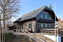 | Ostansicht der Hainfelder Hütte des Österreichischen Touristenklubs auf dem Gipfel des 924 m hohen Kirchenberg in der niederösterreichischen Stadtgemeinde Hainfeld . Ursprünglich wurde im Jahre 1915 unter einer bestehenden Aussichtswarte eine kleine Hütte mit rd. 15 m² errichtet. 1925 erfolgte ein Neubau mit rd. 65 m² und Sitzplätze für 30 Gäste, der 1999 an das Stromnetz der EVN angeschlossen wurde. Dieser Bau wurde wiederum durch einen am 25. September 2005 eröffneten Neubau ersetzt. Sie bietet Platz für 40 Personen in der Hütte und 70 im Gastgarten und ist ganzjährig an den Wochenenden bewirtschaftet. | Eigenes Werk | C.Stadler/Bwag | Datei:Hainfeld - Hainfelder Hütte.JPG | |