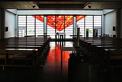 | Pfarrkirche hl. Klaus von Flüe (römisch-katholische Pfarrkirche) Machstraße 8–10,2. Wiener Gemeindebezirk Leopoldstadt. Glasfenster von Günther Kraus (* 20. August 1930 in Klagenfurt; † 19. Februar 1988 in Wien), österreichischer bildender Künstler. | Eigenes Werk | Herbert Josl | Datei:Pfarrkirche Hl. Klaus von Flüe Wien.jpg |