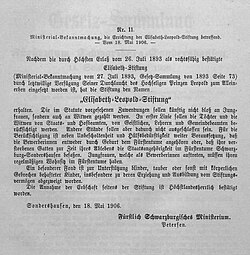 | Bekanntmachung über die Errichtung der Elisabeth-Leopold-Stiftung 1906 | https://zs.thulb.uni-jena.de/rsc/viewer/jportal_derivate_00215404/0057_FTSS_1906_GSN0011_0039.tif | Autor/-in unbekannt Unknown author | Datei:Errichtung der "Elisabeth-Leopold-Stiftung".jpg |