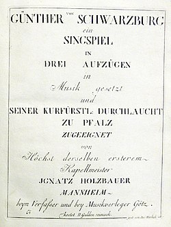 | First page of the original score for Günther von Schwarzburg , published by Johann Michael Götz in 1777. | Diese Datei wurde von diesem Werk abgeleitet: Günther von Schwarzburg EA.jpg | Johann Michael Götz | Datei:Gunther von Schwarzburg Score - Gotz Edition.jpg |
