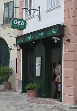 | Fassade des GEA-Ladens in der Pfarrgasse Mödling, Österreich. | Eigenes Werk | Johanna Kokosnuss | Datei:GEA-Moedling.jpg | |