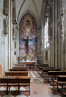 | Die Kreuz- bzw. Prinz-Eugen-Kapelle im Stephansdom in der österreichischen Bundeshauptstadt Wien . Die Kapelle wurde von den Herren von Tirna, eine ritterliche Wiener Bürgerfamilie, gestiftet und zwischen 1358 und 1362 an der Nordwestecke des Domes errichtet. Wegen des großen holzgeschnitzten Kruzifixes, das man vor 1685 hier anbrachte, erhielt die Kapelle den Namen Kreuzkapelle. In der Gruft der Kapelle ist Prinz Eugen von Savoyen († 1736) und Emanuel Thomas von Savoyen († 1729), ein Neffe Prinz Eugens, beigesetzt. Ab 1852 wurde die Kreuzkapelle umgestaltet. Unter anderem erhielt dabei in Ergänzung zu dem spätgotischen Kruzifix die Altarwand ein Fresko, das die Ereignisse auf Golgotha darstellt und das Johann Ender 1853 malte. | Eigenes Werk | C.Stadler/Bwag | Datei:Wien - Stephansdom, Kreuzkapelle (1).JPG |