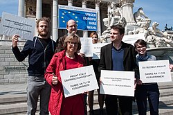 | Gabriela Moser, Sigrid Maurer, Albert Steinhauser in front of the Austrian parliament building. | Vorratsdaten2014-2 | Albert Steinhauser | Datei:2014 04 08-GRÜNE AT-Aktion-Vorratsdaten1 (2).jpg | |