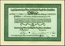 | Namensaktie über 1000 RM der Gagfah - Gemeinnützige Aktien-Gesellschaft für Angestellten-Heimstätten von 1925 | Sammlung eines Mitglieds des Ersten Deutschen Historic-Actien-Clubs e.V. (EDHAC e.V.); (le) | Unbekannte Autoren und Grafiker; Scan vom EDHAC e.V. | Datei:Gagfah 1925.jpg |