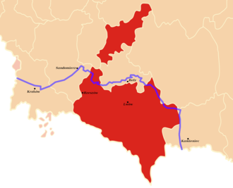 | Borders of Austrian Galicia (blue) imposed on pre-1772 Voivodeships;Background: File:RON województwo ruskie map.svg | Eigenes Werk | D T G | Datei:Austrian Galicia compared to pre-1772 Voivodeships.png | |
