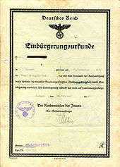 | Einbürgerungsurkunde der Einwandererzentralstelle Nord-Ost, Zweigstelle Lodsch (Łódź). Geburtsort/Herkunftsort Engelsberg , Kreis Dolina in Galizien/Polen, das in der Folge des Hitler-Stalin-Pakts 1939 von der Sowjetunion annektiert worden war. Die deutschsprachige Bevölkerung wurde daher " de:Heim ins Reich " in vom Deutschen Reich annektierte Gebiete Polens umgesiedelt und eingebürgert. | Eigener Scan | Autor/-in unbekannt Unknown author Photographed and uploaded by Hajotthu at de.wikipedia | Datei:Einbürgerungsurkunde–Einwandererzentralstelle Nord-Ost Zweigstelle Lodz.jpg | |