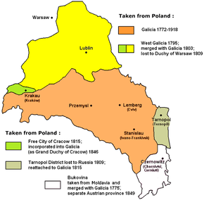 Im Jahre 1772 gelangten Teile Kleinpolens, Podoliens, Rutheniens und des Karpatenvorlandes, die zuvor zu Polen-Litauen gehört hatten, im Rahmen der ersten Teilung Polens an das österreichische Haus Habsburg. Als Königreich Galizien und Lodomerien wurde die Landschaft 1804 dem Kaisertum Österreich angegliedert und gehörte von 1867 bis 1918 als Kronland zum cisleithanischen Teil Österreich-Ungarns.