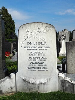 | Grab der Familie Gallia mit Moriz Gallia (1858, Bisenz/Bzenec–1918, Wien) und Hermine Gallia (geb. Hamburger; 1870, Freudenthal/Bruntál–1936, Wien) am Friedhof Hietzing, 1130 Wien (Gruppe 12, Nr. 101–103). | Eigenes Werk | Papergirl | Datei:Grave of Moriz and Hermine Gallia family, Vienna, 2021 (2).jpg | |