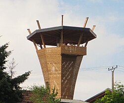 - An der Grenze zu Ehrenhausen, beim 2017 errichteten Wasserhochbehälter Weinleiten, steht seit Juni 2019 der 27 m hohe[12] Wasserturm Weinleiten, kein Wasserturm im funktionellen Sinn, sondern ein Aussichtsturm. 8 bogenförmige Holzsteher spannen den Querschnitt des taillierten Turms oben weiter auf als unten. Eine Spindel-Wendeltreppe aus Stahl führt in der Mittelachse zur Plattform in 21 m Höhe mit Aussicht ins südsteirische Weinland und einen Balkon mit Glasfenster im Boden für den Blick nach unten. Errichter ist der Wasserverband Leibnitzerfeld-Süd, der via 48"-Touchscreen am Hochbehältergebäude daneben und eine Website über die Wasserversorgung und den Weg des Wassers informiert.[13][14]