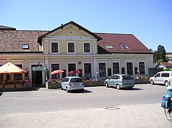 Das Gasthaus ist ein breitgelagerter, ein- bis zweigeschoßiger Bau mit späthistoristischem Putzdekor.