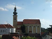 | Südwestansicht der röm.-kath. Pfarrkirche hl. Georg in der niederösterreichischen Marktgemeinde Gaweinstal . Eine barocke Saalkirche mit eingezogenem Chor und Ostturm. Das Langhaus wurde Ende des 17. Jahrhunderts errichtet, der Chor und der Turm Anfang des 18. Jahrhunderts. Am 22. August 1704 brannte die Kirche bis auf die Grundmauern nieder. Bei der anschließenden Wiedererrichtung bzw. -instandsetzung erhielt sie ihre heutige Form. | Eigenes Werk | C.Stadler/Bwag | Datei:Gaweinstal - Kirche (1).JPG |
