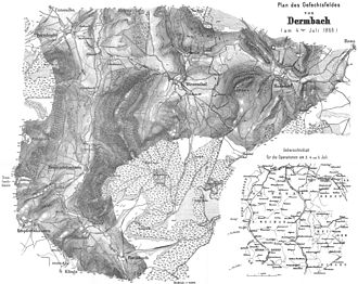 | topographischer Plan des Gefechtsfeldes von Dermbach | Alfred Cramer: "Geschichte des Infanterie-Regiments Prinz Friedrich der Niederlande (2. Westfälisches) Nr. 15"; Berlin 1910, Verlag R. Eisenschmid, Verlagsbuchhandlung für Militärwissenschaft | Autor/-in unbekannt Unknown author , not menioned anywhere | Datei:IR15 – Gefechte bei Dermbach.jpg |