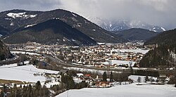 | Blick auf Sankt Michael in Obersteiermark vom Flaterberg. Das Bild zeigt den Ort von Süden. | Eigenes Werk | David Bauer | Datei:St. Michael in Obersteiermark Panorama.jpg |