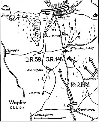„Der Divisionskommandeur hatte gegen seine (Korpsbefehl, Anm. d. Verf.) Durchführung ernste Bedenken. Seine Truppen waren ermüdet. Ein klares Bild vom Feind, sowohl in seiner Flanke wie in der Front, hatten die Meldungen nicht ergeben. Da seine Remonstration gegen den Vormarsch auf Waplitz, die er am heutigen Tage wiederholt vorbracht hatte, ihm vom Generalkommando nur unfreundliche Antworten eingebracht hatten, glaubte er deshalb nicht, dass eine erneute Weigerung über Waplitz anzugreifen, einen Erfolg haben würde und schritt deshalb, wenn auch ungern, an die Ausführung des Unternehmens. Es endete mit einem vollständigen Mißerfolg.“