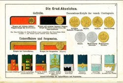 Die Dienstgradbezeichnungen der „Alten Armee“ blieben nach 1918 erhalten, nur jene der Unteroffiziere änderten sich Anfang 1920.[27] Die am 19. Januar 1919 verfügten „Vorläufigen Bestimmungen über die Bekleidung des Friedensheeres“ brachten zwar neue Rangabzeichen, ließen die Dienstgrade Gefreiter und Obergefreiter aber aus. Vermutlich trugen diese weiterhin ihre heraldischen Kragenknöpfe. Die Unteroffiziere und Offiziere unterschied jetzt ein System aus blauen Horizontalstreifen unterschiedlicher Breite, für Unteroffiziere auf dem linken Ober-, für Offiziere auf dem linken Unterärmel.[28]