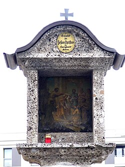 Salzburg–Elisabeth-Vorstadt, Elisabethstraße 1 | Ursprünglich auf der Hirschenwiese frei stehend, im Zuge der Verbauung um die Wende zum 20. Jahrhundert in die Hausfassade integriert, Bild restauriert[4] | ![]() (Josef Gold, um 1910) |