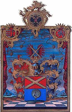 Geteilt oben in rot ein goldenes Andreaskreuz, unten in Blau auf goldenem Boden ein radschlagender natürlicher Pfau; auf dem Helm mit rechts rot-goldenen, links blau-goldenen Decken das Andreaskreuz zwischen offenem rechten Fluge.