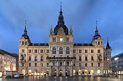 | Rathaus (City Hall) in Graz , Austria. This is an edit of an existing file , with the perspective corrected and a few other minor alterations. | Self-published work by Tamirhassan~commonswiki | Tamirhassan~commonswiki | Datei:GrazerRathaus-edit.jpg | |
