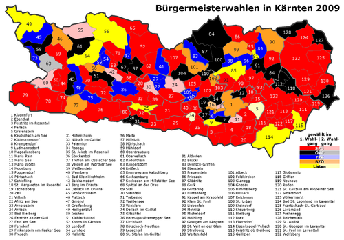 - ↑ Ergebnisse Bürgermeisterstichwahlen 2009 ( des vom 19. März 2022 im Internet Archive) Info: Der Archivlink wurde automatisch eingesetzt und noch nicht geprüft. Bitte prüfe Original- und Archivlink gemäß Anleitung und entferne dann diesen Hinweis. auf der Website des Landes Kärnten