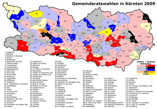 | Gemeinderatswahlen in Kärnten 2009 – Mehrheiten | Eigenes Werk | Davele2014 ( Diskussion ) 19:35, 13 February 2015 (UTC) | Datei:Gemeinderatswahlen in Kärnten 2009 - Mehrheiten.png | |