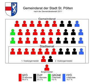 | Mandatsverteilung im Gemeinderat und Stadtsenat St. Pöltens nach der Gemeinderatswahl 2011 | Eigenes Werk | AleXXw | Datei:Mandatsverteilung Gemeinderat und Stadtsenat St Poelten 2011.svg | |