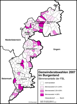 | Stimmenanteile der FBL bei den Gemeinderatswahlen 2007 im Burgenland | Eigene Arbeit, Daten von http://wahlen.bgld.gv.at/wahlens/Default.aspx | Geiserich 77 | Datei:Burgenland Gemeinderatswahlen 2007 FBL.png | |