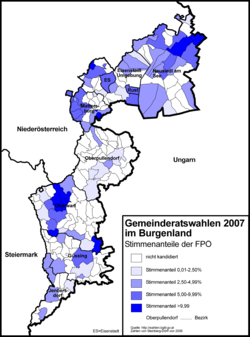 | Stimmenanteile der FPÖ bei den Gemeinderatswahlen 2007 im Burgenland | Eigene Arbeit, Daten von http://wahlen.bgld.gv.at/wahlens/Default.aspx | Geiserich 77 | Datei:Burgenland Gemeinderatswahlen 2007 FPOE.png | |