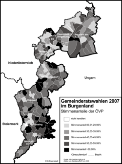 | Stimmenanteile der ÖVP bei den Gemeinderatswahlen 2007 im Burgenland | Eigene Arbeit, Daten von http://wahlen.bgld.gv.at/wahlens/Default.aspx | Geiserich 77 | Datei:Burgenland Gemeinderatswahlen 2007 OEVP.png | |