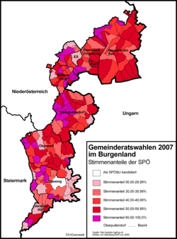 | Stimmenanteile der SPÖ bei den Gemeinderatswahlen 2007 im Burgenland | Eigene Arbeit, Daten von http://wahlen.bgld.gv.at/wahlens/Default.aspx | Geiserich 77 | Datei:Burgenland Gemeinderatswahlen 2007 SPOE.png | |