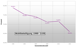 | Niederösterreich – Wahlbeteiligung bei Gemeinderatswahlen 1990–2015 | Eigenes Werk | Davele2014 ( Diskussion ) 08:09, 4 April 2015 (UTC) | Datei:Niederösterreich – Wahlbeteiligung bei Gemeinderatswahlen 1990–2015.png | |