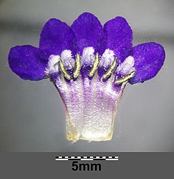 Der Farbwechsel der Blütenkrone von karminrot beim Aufblühen nach einfarbig dunkelviolett als Subtraktionsfarbe in Vollblüte erklärt sich dadurch, dass die Epidermis roten Zellsaft besitzt, das darunter liegende Mesophyll blauen.[6]