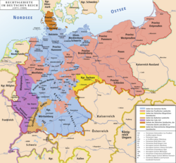 Rechtsgebiete im Deutschen Kaiserreich | Eigenes Werk /Source of Information: Putzger – Historischer Weltatlas, 89. Auflage, 1965; Westermanns Großer Atlas zur Weltgeschichte, 1969; Haacks geographischer Atlas. VEB Hermann Haack Geographisch-Kartographische Anstalt, Gotha/Leipzig, 1. Auflage, 1979; dtv-Atlas zur Weltgeschichte Band 1: Von den Anfängen bis zur Französischen Revolution; 23. Aufl. 1989, ISBN 3-423-03002-X | Ziegelbrenner | Datei:DR Fields of Law.png | |