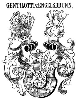 | Wappen derer von Gentilotti zu Engelsbrunn | de:Moritz Maria Weittenhiller , de:J. Siebmacher’s grosses und allgemeines Wappenbuch , IV. Band, 6. Abteilung; Der Salzburgische Adel, 1883, S. 18, Tafel 7 | Johann Siebmacher | Datei:Gentilotti-Wappen Sm.png | |