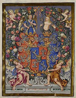 | Wappen der Gentilotti von Engelsbrunn | Pergamentmalerei (Adelsbrief: Kaiser Leopold I., Erhebung in den Reichsritterstand); Digitale Bibliothek des Trentino, Ikonographie: 16070 | Autor/-in unbekannt Unknown author | Datei:Gentilotti von Engelsbrunn-Wappen 1685.jpg | |