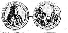 | Gedenkmünze Georg Adolf Freiherr von Micrander , Brandenburg, 1691 Die Umschrift ist: GEORG ius ADOLPH us LIB er B aro DE MICRANDER SER enissimi EL ectoris BRAND enburgici GEN eralis EXCVP iarum PR EF ectus ET VRB is FRANC ofurtensis GVB ernator Übersetzung:Georg Adolph Freiherr von Micrander des durchlauchtigsten Kurfürsten zu Brandenburg General und Gouverneur zu Frankfurt an der Oder Auf der Rückseite: der Kriegsgott Mars mit Regimentsstab und Micranderischem Wappenschild, dazu zahlreiche Kriegsutensilien. Links stehen due Göttin Pallas Athene, mit wissenschaftlichen Gegenständen wie Globus, Bücher etc. | Der brandenburgischen historischen Münzbelustigungen dritter Theil, S.295 1 | Johann Jakob Spieß | Datei:Micrander-muenze.jpg |