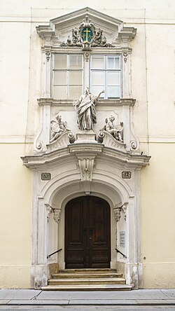 | Portal des Salvatorianerkonvent, ehem. Barnabitenkloster, Habsburgergasse 12 in Wien Dieses Bild zeigt das in Österreich unter der Nummer 50537 denkmalgeschützte Objekt. ( Commons , de , Wikidata ) | Selbst fotografiert | Radler59 ( Diskussion ) | Datei:Wien Habsburgergasse 12 Portal.jpg |