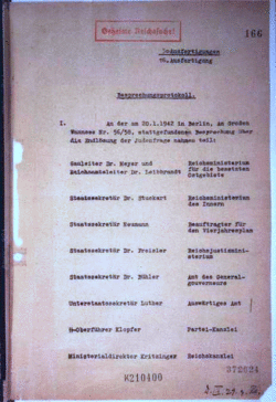 | das Originaldokument (mit der Signatur Inland II g 177, Bl. 165ff) liegt im Politischen Archiv des deutschen Auswärtigen Amtes in Berlin. Dokumente aus der NS-Zeit sind so genannte "public domain", d.h. unterliegen keinem Copyright oder Nutzungsbestimmungen, sofern sie sich nicht in Privatbesitz befinden. /Leiter der Verwaltung, Haus der Wannsee-Konferenz | http://www.ghwk.de/deut/proto.htm . Uploader was Moskau at sv.wikipedia | Adolf Eichmann | Datei:Wannsee sida 1.gif |