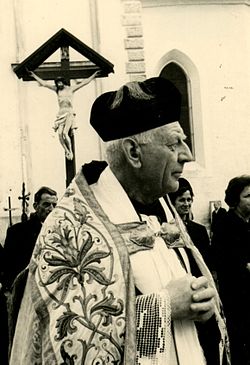 | Msgr Schelling ca. 1965 (* 26. September 1906 in Buch, Vorarlberg; † 8. Dezember 1981 in Rum, Tirol) war katholischer Priester, Chefredakteur sowie Häftling und Lagerdekan im KZ Dachau. Bild Xaver Bechtiger | Eigenes Werk | Fad | Datei:Schelling Msgr Georg.jpg |