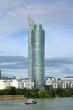 | Der Millennium Tower im 20. Wiener Gemeindebezirk Brigittenau von der Brigittenauer Brücke aus gesehen. Das Büro- und Wohnhochhaus wurde von 1997 bis 1999 nach Plänen der Architekten Gustav Peichl, Boris Podrecca und Rudolf F. Weber für den Bauherrn Georg Stumpf mit einem Kostenaufwand von rd. 210 Millionen Euro errichtet. Das Gebäude hat eine Gesamthöhe von 202 Meter (Dachfirst 160 Meter) und ist damit nach dem Donauturm (252 Meter) und dem ersten Hochhaus der DC Towers (250 Meter) das dritthöchste Gebäude Wiens. Der Tower hat über 50 Geschosse, rund 47.200 Quadratmeter Büro- und 30.000 Quadratmeter Wohnfläche sowie 14.000 Quadratmeter für Dienstleistungs- beziehungsweise 10.000 Quadratmeter für Einzelhandelsbetriebe. | Eigenes Werk | C.Stadler/Bwag | Datei:Wien - Millennium Tower (2).JPG |