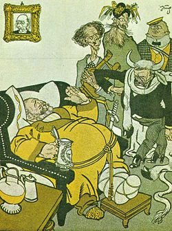 | Austrian politician Georg Schoenerer was sentenced to prison because in 1888 he conducted a raid on a newspaper office that had prematurely published the death notice of Kaiser Willhelm I. While doing so, he was drunk, and thus this political cartoon responds to his situation. | Hellmut Andics, Das österreichische Jahrhundert .Die Donaumonarchie 1804-1918 (Vienna: Molden, 1974). | Datei:Georg Schoenerer.jpg | ||