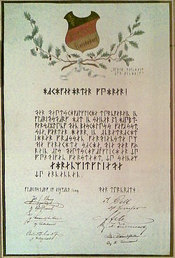 | Mitgliedsurkunde des Floridsdorfer Turnvereins für Georg von Schönerer in Runenschrift. Heimatmuseum Zwettl. „Durch Reinheit, zur Einheit.“ Hochgeehrter Führer! Der Deutschvölkliche Turnverein in Floridsdorf hat in seiner 31. Hauptversammlung den Beschluss gefasst, Sie, werter Herr, in anbetracht Ihrer großen Verdienste um die gerechte Sache, die der Verein als Deutschvölklicher zu würdigen versteht, zu seinem Ehrenmitgliede zu ernennen. Floridsdorf, im Eis-Mond Januar 2009 = 1896; die deutschvölkische Bewegung betrachtete die Schlacht von Noreia im Jahre 113 v. Chr. als Beginn ihrer Zeitrechnung, der Turnrath.“ Von den 24 verwendeten Runen haben 14 die Runenzeichen aus dem Codex Runicus als Grundlage. Die restlichen runenähnlichen Zeichen sind von Georg von Schönerer frei erfunden. Schönerers Runenzeichen werden auch im Bismarckturm auf dem Grünberg bei Eger verwendet. | Original uploader was Stefan.lefnaer at de.wikipedia . ( Originaltext: selbst fotografiert im Stadmuseum Zwettl , 22.8.2009 ). Übertragen aus de.wikipedia nach Commons durch AndreasPraefcke mithilfe des CommonsHelper . (and copyfraud license removed; the image is in the public domain as mere reproduction of a two-dimensional work). | Anonym Unknown author Photo: Stefan Lefnaer | Datei:Georg Schoenerer2.jpg | |