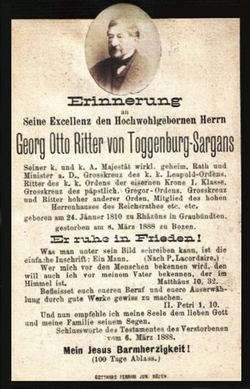 | Sterbebild Sr. Excellenz des Herrn Georg Ritters von Toggenburg in Bozen, vormaliger Statthalter von Tirol (24. Januar 1810 in Rhäzüns, Kanton Graubünden; † 8. März 1888 in Bozen), am 10. März 1888 bestattet zu Bozen ( Report darüber in den „Innsbrucker Nachrichten“ d.d. 15. März 1888 ) | Sterbebild (In memoriam-Karte) | Autor/-in unbekannt Unknown author | Datei:Georg Otto Ritter von Toggenburg.png | |
